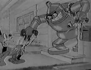 The robot chases the two of them outside the house, wreaking havoc and even shocking Bosko's dog. They run away as fast as they possibly can till finally they are chased to a construction site, where Bosko finds a stick of dynamite. He tosses it at the steel man blowing it up, and saving the day.