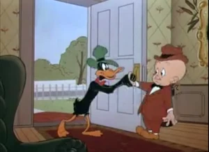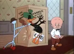 Later that day, Elmer furiously returns to his house, hitching a ride in a truck from the Duluth Van and Storage Co. Daffy greets Elmer at the front door and welcomes him to his new future-antic push button home. Elmer sees that his house is different and asks Daffy what he's done, but Daffy quickly pushes a button and a machine removes Elmer's hat and coat. Daffy then guides Elmer to a massaging chair. Elmer likes it at first, but Daffy pushes a button and Elmer receives an aggressive massage, which dazes him. The chair then automatically puts a cigar in Elmer's mouth and lights it, but the smoke activates a robot fire extinguisher from another room which douses Elmer with a bucket of water. Daffy states that the extinguisher is very sensitive to heat and probably needs adjusting, then guides Elmer into the kitchen. Daffy encourages Elmer to bask in the kitchen's "treasure trove of work-saving appliances" and demonstrates a new knife sharpener which ends up destroying the blade on one of Elmer's knives. Undaunted, Daffy points out the garbage disposal, which is revealed to be a pig which is housed under the kitchen sink.
