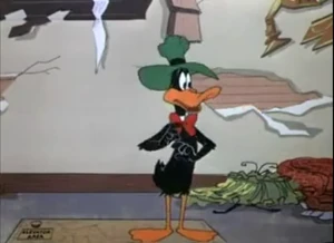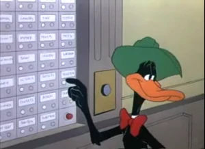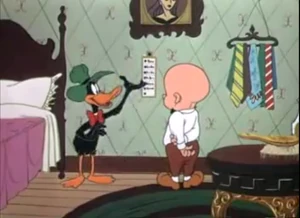 Daffy then takes Elmer into a bedroom and shows him a device which will automatically tie a necktie from the options of Bow, Four-in-hand, Five-in-hand, False Granny, Windsor, Smindsor, and an unlabeled option. Daffy tries to demonstrate it but the machine ties Elmer up into a manner of a noose. "Help! Get me down!" Daffy shuts off the machine and casually refers to the style as the "Alcatraz Ascot" as if it were a type of necktie, the unlabeled option. Elmer is exhausted, telling Daffy that he wants all of the "push-button nonsense" removed and tries to go upstairs and take an aspirin, but cannot do so because his stairway has been removed. Daffy confidently boasts that there is no need to walk up stairs in a push-button home, and uses an elevator-like device to bring the "upstairs downstairs". Elmer seems impressed but asks what happens to the downstairs, and Daffy, saying "Say, that's a good question! What do you say we find out?" raises the upstairs which shows that everything downstairs has been destroyed.
