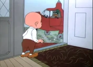 Elmer asks if there is "any more cwever gadgets to demonstwate, Mr. Smarty Salesman?", and when Daffy says no, Elmer makes a phone call but the conversation is inaudible. When Elmer hangs up there is a knock on his front door and a large crate is brought inside. Elmer opens the crate and starts the motor, telling Daffy about his new "future-antic push-button salesman ejector" which grabs Daffy by the shoulders and wheels him out of the house, kicking him repeatedly. With Daffy gone, Elmer remembers the red button and wonders "what that wed button is for?" He pushes it and a display reads "IN CASE OF TIDAL WAVE". A hydraulic lift raises his house high into the air. Elmer looks out of the front door, and Daffy flies by in a helicopter and says, "For a small price, I can install this little blue button to get you down!"