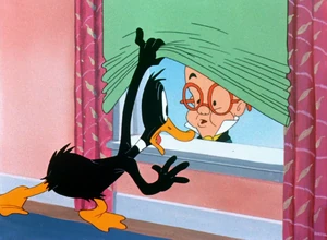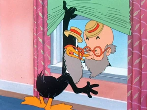 Hiding in his house, Daffy looks out, eventually seeing the little man, who attempts to hand him a telegram (presumably with Daffy's conscription order). Daffy continues to try and outrun the little man, who seems to be everywhere that Daffy happens to be at the moment.