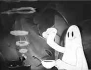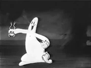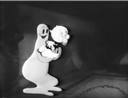 He switches songs and quickly takes a bath, when he hears someone knocking. Quickly getting downstairs, the ghost sees Porky outside of the door. He imitates a woman and tells Porky to come in, then vanishes.