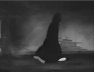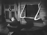 Porky sneaks around while trying to determine what may be going on and the ghost hides in a random room. He puts two frogs into a pair of shoes and puts them down to make it seem as if someone is following Porky. The shoes soon get stuck around a coat rack, and eventually a jacket or blanket gets draped over it, making it resemble a figure dressed in a pure black cloak. Behind Porky is the ghost creeping up on him. He bangs on a pot lid to scare him, then vanishes again as Porky turns to see the "figure" approach. As he opens the door, Porky finds the ghost and runs up multiple flights of steps and right into the ghosts arms.