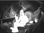At the location, a bunch of strange goings-on occur throughout the house. Inside, a bunch of noise is coming from the ghost listening to spooky radio show. He turns off the radio, then resumes smoking his cigar. He eats the smoke rings like donuts with his coffee. He sings for a moment and screams and makes noises all of the sudden before resuming.