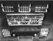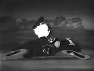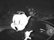 Upon realizing this he quickly runs down all of the steps and out the door. The ghost chases Porky outside and Porky quickly drives his car. As the ghost acts as a hitch-hiker, Porky speeds on by, stopping for a moment to come back and hold up a sign saying "No riders". He speeds on by again as exhaust smoke from his car blows on the ghost.