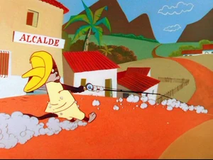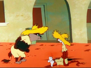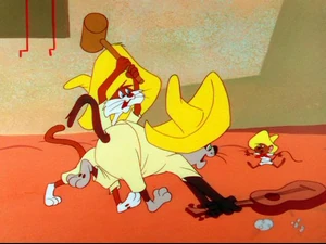Later, they lower a cheese at Speedy's mousehole. Jose tells Manuel about the plan like to Bugs Bunny. Speedy grabs the cheese dragging Jose with him all the way to Los Angeles and Jose tries to hold him back but only pull his tail fur off. Manuel is pacing back and forth wondering where Jose is who been away after being dragged away by the fast rodent, then notices Jose arrives with a bundle stick carrying on his shoulder and is happy to see him back. Jose and Manuel lit a dynamite on Speedy's mousehole and hide on a corner waiting for the explosion. Speedy appears behind them unnoticed with a balloon in his hand and pops it causing the cats to check the mousehole. Jose blocks it from Manuel asking what he is doing and he replies that he want the mouse but he shouts it's mine not yours. Manuel tries to grab the mouse and Jose grabs his tails causing them both to fight each other over to Speedy. Jose pushes Manuel away and looks inside the mousehole seeing the dynamite hasn't exploded and goes to Manuel that he was right and rightfully yours and Manuel thanks him and Jose welcomes him. Manuel goes to Speedy's mousehole and looks inside and Jose covers his ears. The dynamite explodes on Manuel's face causing him to lament "Caramba!"