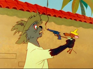 Later at the corner, Manuel tells Jose that Speedy has a cousin named Slowpoke Rodriguez the slowest mouse in all Mexico. Jose goes to Slowpoke's mousehole and hides on a column. Manuel chases him trying to tell something about Slowpoke. Slowpoke walks out of his mousehole and Jose grabs him. Slowpoke lifts his gun and shoots him as Manuel arrives too late telling that Slowpoke packs a gun. Slowpoke returns to his mousehole and blows the smoke out from his gun, leaving Jose to lament, "Now he tell me."