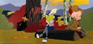 - Like "Rabbit Fire" and "Duck! Rabbit, Duck!", all scenes of Daffy getting blasted by Elmer's shotgun were edited when aired in the 1980s and 1990s on ABC, CBS, the syndicated and Fox network versions of Merrie Melodies Starring Bugs Bunny & Friends, and The WB. While ABC, Fox, and the syndicated versions replaced the actual shots of Elmer firing at Daffy's head with a still shot of Bugs looking off-screen (or, in the case of the end of "Rabbit Seasoning", freeze-framed on the shot of the cabin when Elmer and Daffy go inside) and had the audio play normally, CBS and WB spliced out any and all scenes (both visual and audio) of Daffy getting shot.[1]