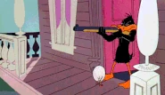 Meanwhile, at Daffy's house, his wife Daphne is knitting a tiny sweater. He tries it on, only for Daphne to tell him it's for a new baby. Daffy, not taking to the idea of having another mouth to feed, sets up all manner of anti-stork measures in an attempt to keep the stork away; anti-aircraft guns on the roof, bear traps in the bushes, a trampoline in the fireplace, a guillotine in the doorway, and alligators in the basement. The stork tries to deliver him an egg, and somehow evades all of the traps as Daffy falls into them. Legs pop out of the egg, so the stork lets it wander into Daffy's house, and he leaves. When the egg hatches, it looks just like the stork, so Daffy flies it back to him, happy to finally give him a dose of his own medicine.