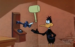 With Daffy out of the way, Speedy continues to play his music. Meanwhile, Daffy, back in bed and fully recovered from his incident with the vacuum, finally admits defeat and happily plays a pair of cymbals to the tune of Speedy's music.