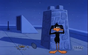 Daffy later attempts to "make the joint jump" with a grenade, which Speedy and his friends constantly pop back at him until it finally blows up and Daffy recites an odd poem, with his own feathers floating like snow.