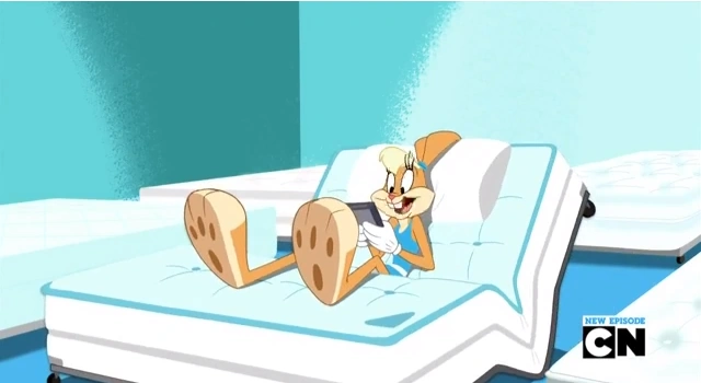 At Home Warehouse, Lola is trying out a bed, before she accidentally gets caught in the bed before Daffy lets her out. While Lola was in the bed, Daffy used a display toilet by mistake. They decide to quickly leave that section. Bugs looks up information on Cecil the Turtle, and finds there have been many cracked shell lawsuits before now. Porky comes in, and tells him he almost ran over Cecil as well. Daffy and Lola get kicked out of the store for using the display toilet.