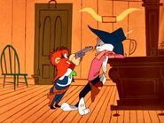 They begin the typical ten-pace and fire, only with Bugs going the same way Sam does, when Sam cheats in the count, "1, 2, 3, 4, 5, 10!" Sam turns to fire, but fires directly past Bugs, who then kisses him on the nose. After Bugs does it again, Sam calls off the "Gentlemen's Duel" and forces Bugs to fight "dirty", so they each go to opposite ends of a bar shooting at each other. As Sam goes to one end, Bugs blasts him in the face, and when Sam tries to return, Bugs outruns and blasts him again. Unfortunately, their fight is interrupted when Sam hears a train whistle. Seeing that it's 5:15, Sam tells Bugs that he's cutting the gunfight short so that he can catch and rob the train.